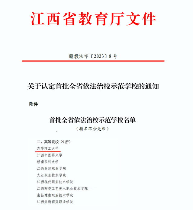 近日,省教育厅印发《关于认定首批全省依法治校示范学校的通知》(赣教法字〔2023〕8号),华体会体育官方网站入选“首批全省依法治校示范学校”,全省共9所高校入选。