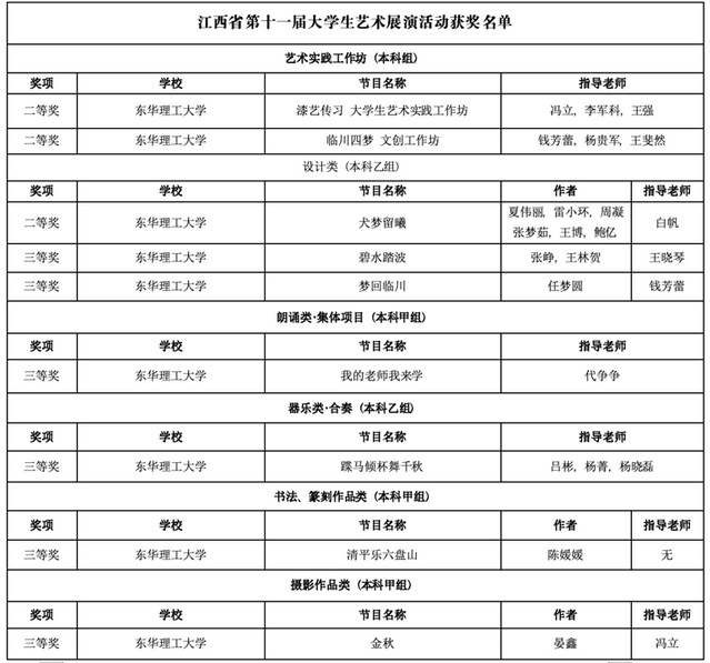 据悉,江西省大学生艺术展演活动由江西省教育厅主办,每三年举行一次,已成为江西省规格最高、规模最大、参与面最广、影响力最大的大学生艺术盛会。在本次展演活动中所取得优异成绩,充分展示了学校在大学生美育教育工作中的艺术教育成果,彰显了东华理工学子的青春风采和艺术才华。(文/图 代争争)