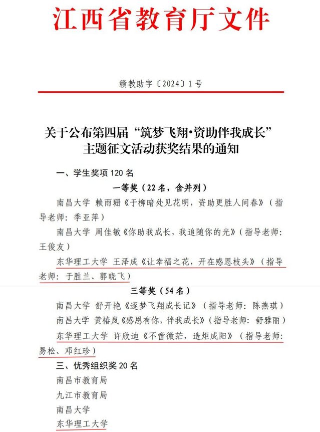 近日,江西省教育厅公布了第四届“筑梦飞翔·资助伴我成长”主题征文活动获奖结果,华体会体育官方网站获得一等奖1项、三等奖1项,第四次蝉联“优秀组织奖”。