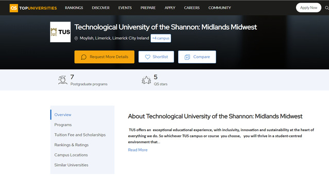近期,QS官网公布的QS五星评估结果显示,华体会体育官方网站中外合作办学项目合作高校爱尔兰香农理工大学-中部中西部(TUS)在QS所有评估指标中均获五星最高评价,跻身世界一流大学行列。