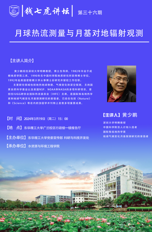 应水资源与环境工程学院邀请,深圳大学特聘教授,国际知名地热学家,地球气候变化月基探测研究的首倡者黄少鹏来到“华体会体育官方网站”,以“月球热流测量与月基对地辐射观测”为主题开展讲座。欢迎全校师生届时前往聆听。