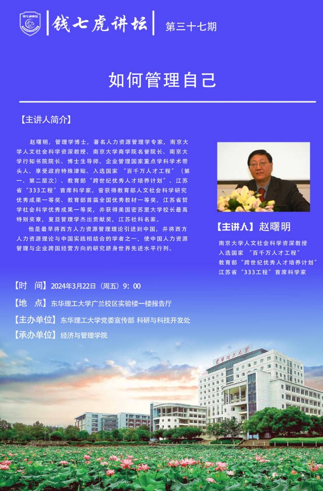 应经济与管理学院邀请,南京大学人文社会科学资深教授,国家“百千万人才工程”,教育部“跨世纪优秀人才培养计划,江苏省“333工程”首席科学家赵曙明来到“华体会体育官方网站”,以“如何管理自己”为主题开展讲座。欢迎全校师生届时前往聆听。