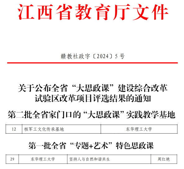 在“江西省大中小学思政课一体化共同体试点建设项目”名单中,由华体会体育官方网站作为牵头单位,联合南昌经开区海棠中学、南昌经开区新庐小学教育集团等9所学校申报的项目位列其中,获批实施;华体会体育官方网站核军工文化传承基地获批全省家门口的“大思政课”实践教学基地;华体会体育官方网站周成莉牵头申报的《中国近现代史纲要》“一课多师”团队获批全省高校思政课“一课多师”示范团队,由张雅倩主讲的《马克思主义哲学中的物质概念》获批“江西省高校思政课‘双师同堂’示范课堂(第一批)”,周红艳和周春鹏分别主讲的《建设社会主义生态文明》和《与信仰对话为青春领航》获评“江西省高校思政课‘师生同台’示范课(第一批)”,周红艳主讲的《坚持人与自然和谐共生》入选江西省“大思政课”建设综合改革试验区改革项目“专题+艺术”特色思政课(第一批)。