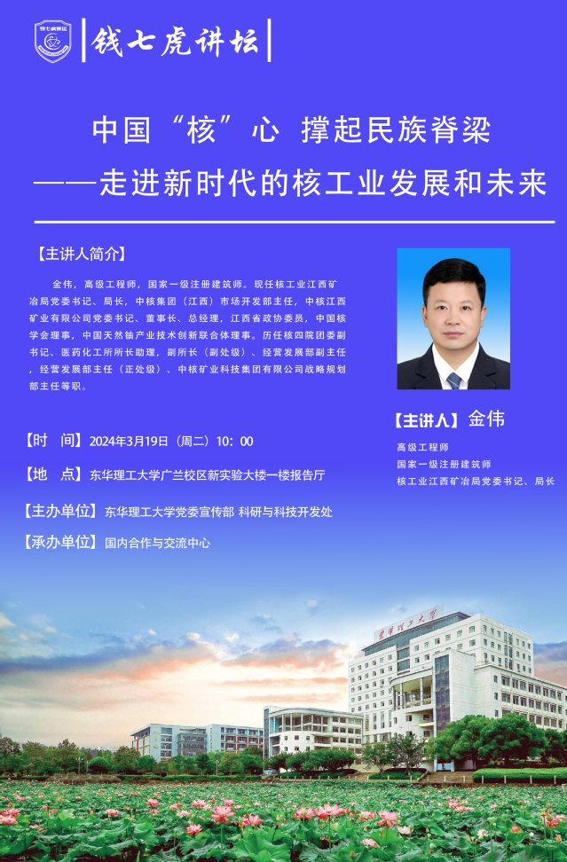 应国内合作与交流中心邀请,核工业江西矿冶局党委书记、局长金伟来到“华体会体育官方网站”,以“中国‘核’心 撑起民族脊梁——走进新时代的核工业发展和未来”为主题开展讲座。欢迎全校师生届时前往聆听。