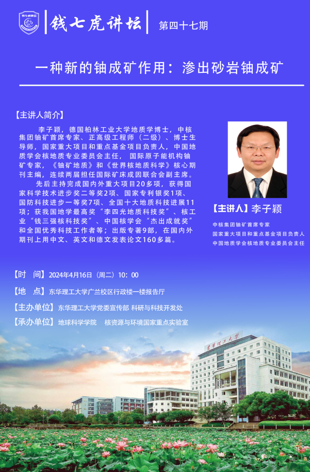 应地球科学学院、核资源与环境国家重点实验室邀请,德国柏林工业大学地质学博士,中核集团铀矿首席专家李子颖到“华体会体育官方网站”,以“一种新的铀成矿作用:渗出砂岩铀成矿”为主题开展讲座。欢迎全校师生届时前往聆听。