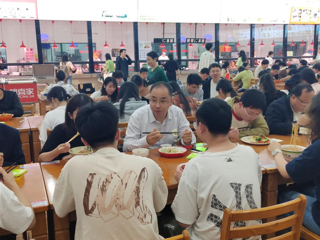 随后,徐景坤一行来到抚州校区学府校园美食城,与来自不同学院的30名学生共进晚餐。校领导与同学们一边进餐一边交流,现场气氛活跃。徐景坤勉励同学们,既要怀抱梦想又要脚踏实地,要敢想敢为又善作善成,珍惜大学时光,不断完善自己,为今后走向社会打下坚实的基础。同学们纷纷表示一定会志存高远,勤学笃行,以拼搏成就人生梦想,用奋斗书写青春答卷。