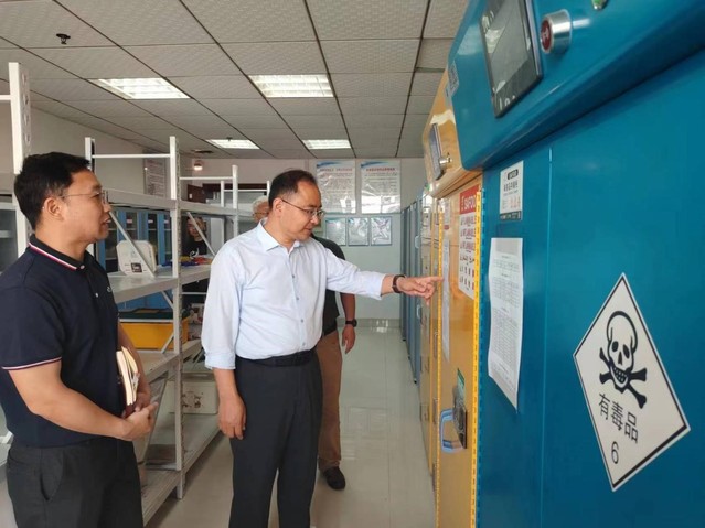 徐景坤一行先后对核资源与环境国家重点实验室、分析测试研究中心、江西省质谱科学与仪器重点实验室、水资源与环境工程学院、化学与材料学院等单位实验室,以及危险化学品仓库、放射源库等场所进行了全面检查。现场查阅危化品台账、上墙安全管理制度、实验室安全管理记录等,并与实验室师生进行深入交流,全面了解实验室安全运行和管理情况。