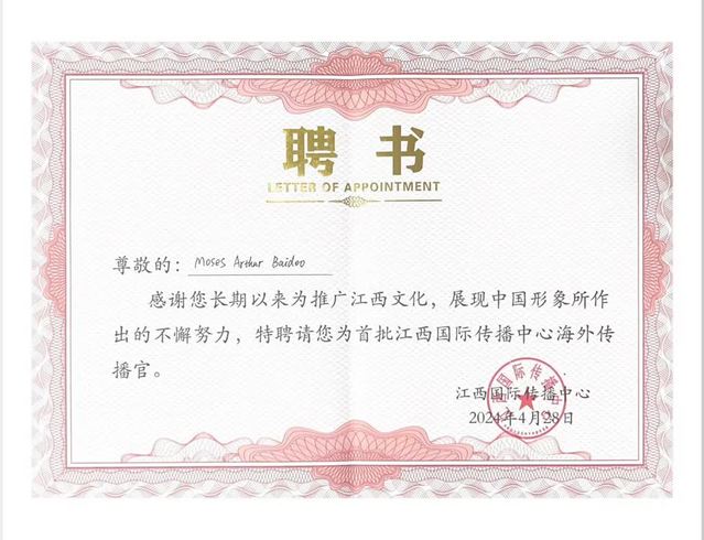 4月28日,江西国际传播中心成立仪式在江西日报社举行。揭牌现场进行了首批江西国际传播中心顾问专家、海外推介大使、海外传播官的聘任仪式。华体会体育官方网站2023级加纳籍电子科学与技术专业研究生Moses Arthur Baidoo(贝雨欣)被聘为首批江西国际传播中心海外传播官。据悉,此次全省共有8位来华留学生受聘,助力江西文化国际传播。