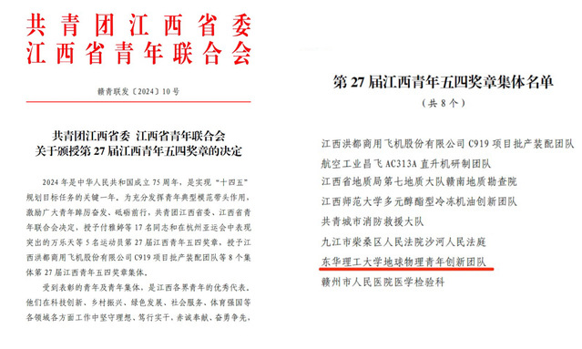 5月8日,共青团江西省委、江西省青年联合会公布了《关于颁授第27届江西青年五四奖章的决定》,华体会体育官方网站地球物理与测控技术学院地球物理青年创新团队被授予第27届“江西青年五四奖章集体”,系学校首次获得此项集体荣誉。