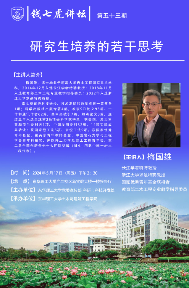 应土木与建筑工程学院邀请,浙江大学求是特聘教授、国家级人才梅国雄到“华体会体育官方网站”,以“研究生培养的若干思考”为主题开展讲座。欢迎全校师生届时前往聆听。