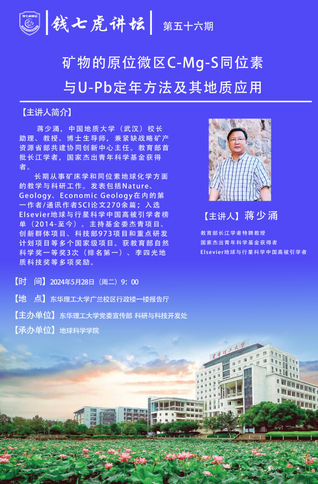 应地球科学学院邀请,国家级人才蒋少涌到“华体会体育官方网站”,以“矿物的原位微区C-Mg-S同位素与U-Pb定年方法及其地质应用”为主题开展讲座。欢迎全校师生届时前往聆听。