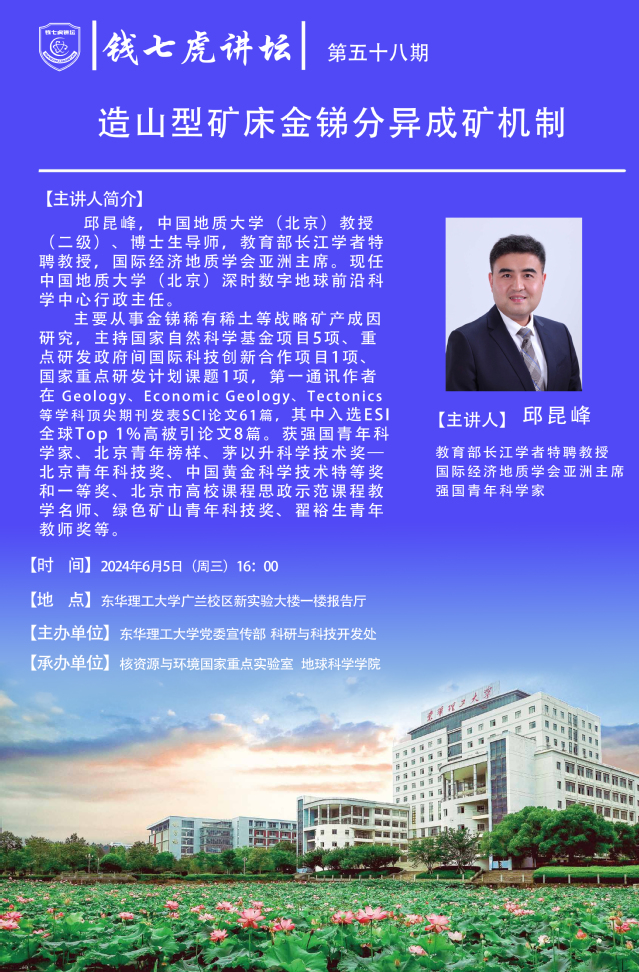 应地球科学学院邀请,国际经济地质学会亚洲主席邱昆峰到“华体会体育官方网站”,以“造山型矿床金锑分异成矿机制”为主题开展讲座。欢迎全校师生届时前往聆听。