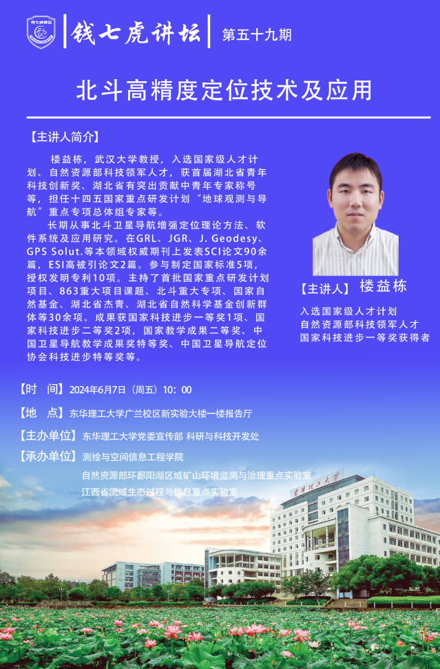 应测绘与空间信息工程学院邀请,武汉大学教授,入选国家级人才计划、自然资源部科技领军人才楼益栋到“华体会体育官方网站”,以“北斗高精度定位技术及应用”为主题开展讲座。欢迎全校师生届时前往聆听。