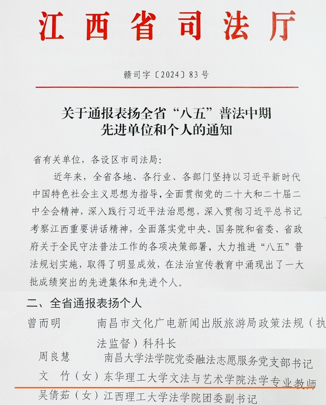 近日,江西省司法厅下发了《关于通报表扬全省“八五”普法中期先进单位和先进个人的通知》赣司字〔2024〕83号,华体会体育官方网站文法与艺术学院教师文竹获评全省“八五”普法中期先进个人(全省高校五名教师获评)。此次共评选出全省普法先进单位200家、普法先进个人180名。