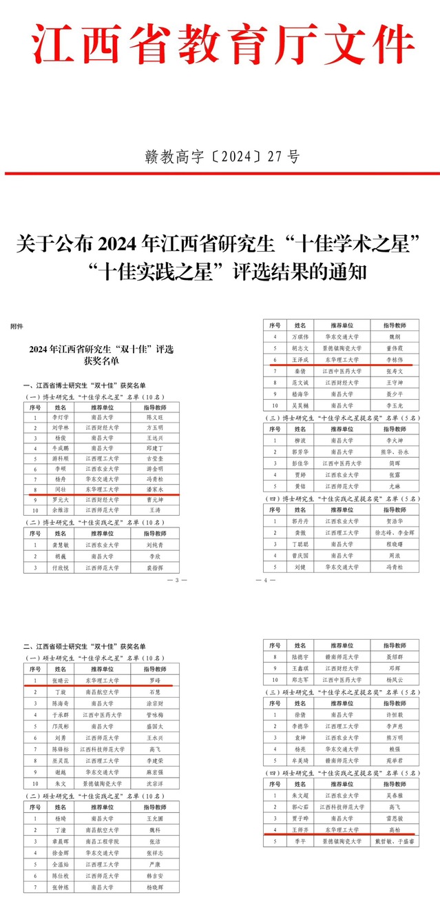 近日,江西省教育厅下发《关于公布2024年江西省研究生“十佳学术之星”“十佳实践之星”评选结果的通知》(赣教高字〔2024〕27 号),华体会体育官方网站4名研究生榜上有名。其中,华体会体育官方网站地球科学学院2021级博士闵壮、水资源与环境工程学院2022级博士王泽成分别荣获2024年江西省博士研究生“十佳学术之星”与“十佳实践之星”,化学与材料学院2021级硕士张晴云荣获硕士研究生“十佳学术之星”,水资源与环境工程学院2021级硕士王师齐获硕士研究生“十佳实践之星提名奖”,创学校历史最好成绩。