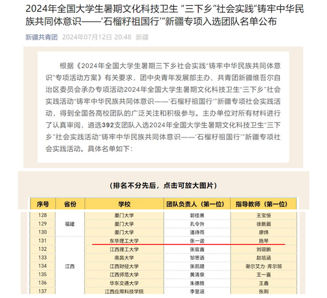 近日,由团中央青年发展部主办、共青团新疆维吾尔自治区委员会承办专项活动2024年全国大学生暑期文化科技卫生“三下乡”社会实践活动“铸牢中华民族共同体意识——‘石榴籽祖国行’”新疆专项社会实践活动团队评选结果揭晓,华体会体育官方网站“灯塔”实践队成功入围。全国共有392支团队入选。