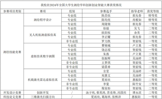 近日,由中国测绘学会教育工作委员会主办的“2024年全国大学生测绘学科创新创业智能大赛”落下帷幕。华体会体育官方网站荣获特等奖2项、一等奖8项、二等奖10项,郭先春、肖根如获“优秀指导教师奖”。