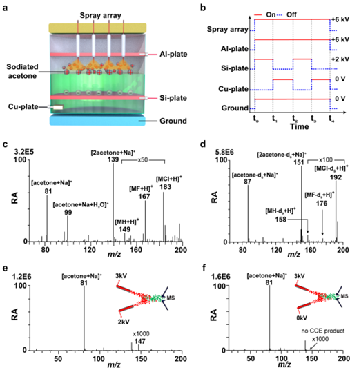 张小平团队开发了一种前沿技术——通过电场驱动克服库仑排斥力。该项技术利用正电荷之间的排斥力将有机离子的平动能快速转化为振动能,从而诱发一些不受官能团限制的化学反应。他们自主设计并研制了一套包括毛细管喷雾阵列、反应容器组件、电极模块和电压控制模块等在内的新型实验装置,成功实现了两个正离子的碰撞与反应,获得了相应的碳碳偶联反应产物。中国科学院大连化学物理研究所的理论研究员团队通过高精度的分子动力学模拟对这一创新成果进行了验证,充分证明两个带正电荷的有机物质可以通过同性电荷之间的排斥效应,作为一种“虚拟催化剂”来促进碳链增长反应。