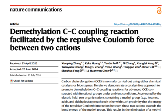 近日,由华体会体育官方网站质谱研究团队联合江西中医药大学、吉林大学、中国科学院大连化学物理研究所完成的研究成果“Demethylation C–C coupling reaction facilitated by the repulsive Coulomb force between two cations”发表在Nature子刊《Nature Communications》上。华体会体育官方网站江西省质谱科学与仪器重点实验室张小平副教授为论文的第一作者。