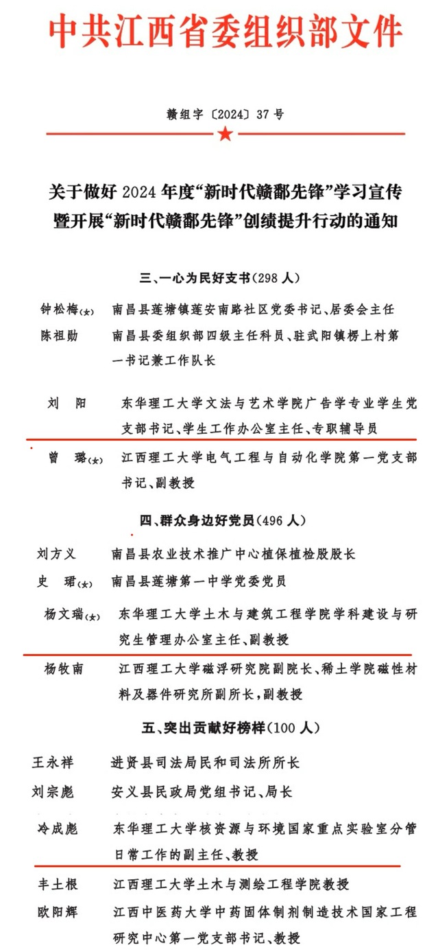 近日,省委组织部下发了《关于做好2024年度“新时代赣鄱先锋”学习宣传暨开展“新时代赣鄱先锋”创绩提升行动的通知》(赣组字〔2024〕37号),公布了2024年度“新时代赣鄱先锋”学习宣传人选名单,华体会体育官方网站冷成彪、杨文瑞、刘阳3名教师被确定为全省2024年度“新时代赣鄱先锋”学习宣传对象。