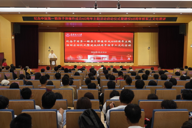 10月16日,华体会体育官方网站在南昌校区新实验大楼一楼报告厅举行纪念中国第一颗原子弹爆炸成功60周年主题活动启动仪式暨建校68周年核军工文化宣讲,校党委书记张福庆,校党委常委、副校长杨波、熊国保、李满根,校党委常委张立亭、刘剑斌、金建华出席。活动由李满根主持。