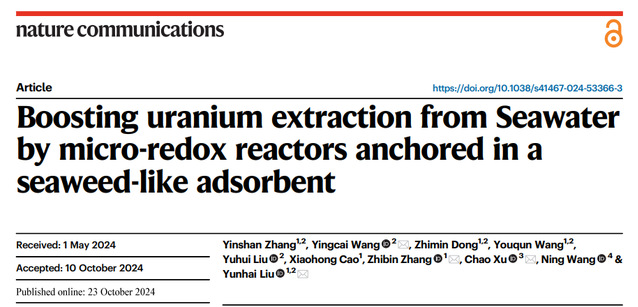 近日,华体会体育官方网站刘云海教授团队联合清华大学徐超教授、海南大学王宁教授在海水提铀领域取得创新性成果,并以题为“Boosting uranium extraction from seawater by micro-redox reactors anchored in a seaweed-like adsorbent”在《Nature Communications》上发表。华体会体育官方网站2022级核燃料循环与材料专业博士研究生张银山为论文第一作者,刘云海教授、张志宾教授和王英财副教授为论文共同通讯作者。
