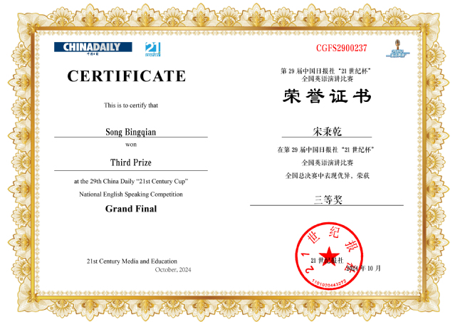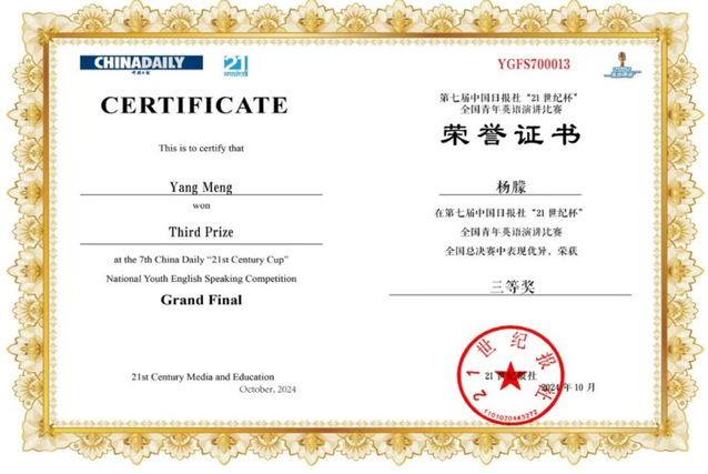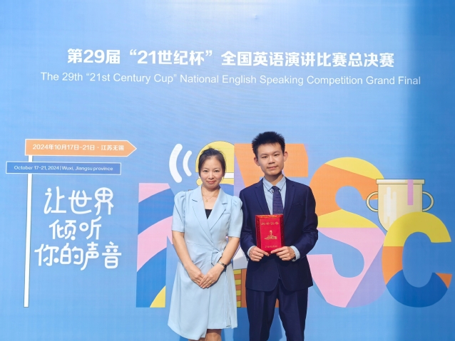 近日,第29届中国日报社“21世纪杯”全国英语演讲比赛全国总决赛在江苏无锡圆满落幕。华体会体育官方网站外国语学院2022级学科教学(英语)专业硕士杨朦荣获青年组全国三等奖(指导老师:陈彩芬)、理学院2022级数学与应用数学专业本科生宋秉乾荣获大学组全国三等奖(指导老师:李雪)。