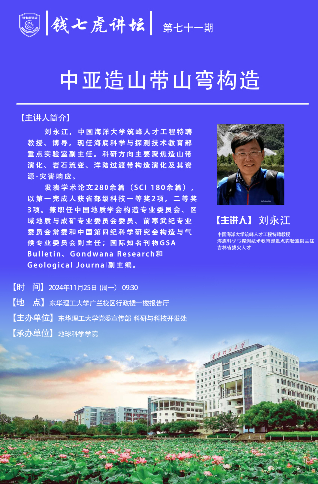 应地球科学学院邀请,中国海洋大学筑峰人才工程特聘教授、博导刘永江到“华体会体育官方网站”,以“中亚造山带山弯构造”为主题开展讲座。欢迎全校师生届时前往聆听。
