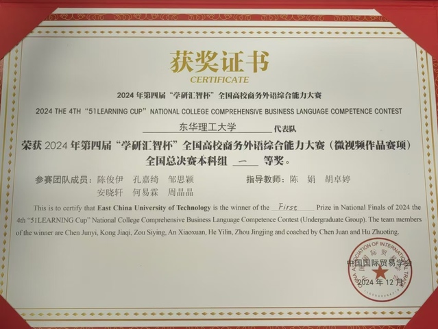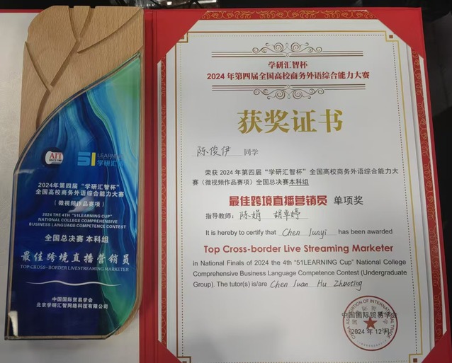 12月7日,2024年“学研汇智杯”全国商务外语综合能力大赛全国总决赛在湖南大学圆满落幕。华体会体育官方网站外国语学院学生孔嘉绮、安晓轩、邹思颖、周晶晶、陈俊伊、何易霖组成的学生团队(指导老师:陈娟、胡卓婷)以省赛第一的成绩进入全国总决赛,并荣获全国一等奖。陈俊伊荣获最佳跨境直播营销员单项奖。