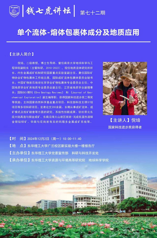 应地球科学学院邀请,地质流体研究所所长、内生金属成矿机制研究国家重点实验室副主任倪培到“华体会体育官方网站”以“单个流体-熔体包裹体成分及地质应用”为主题开展讲座。欢迎全校师生届时前往聆听。