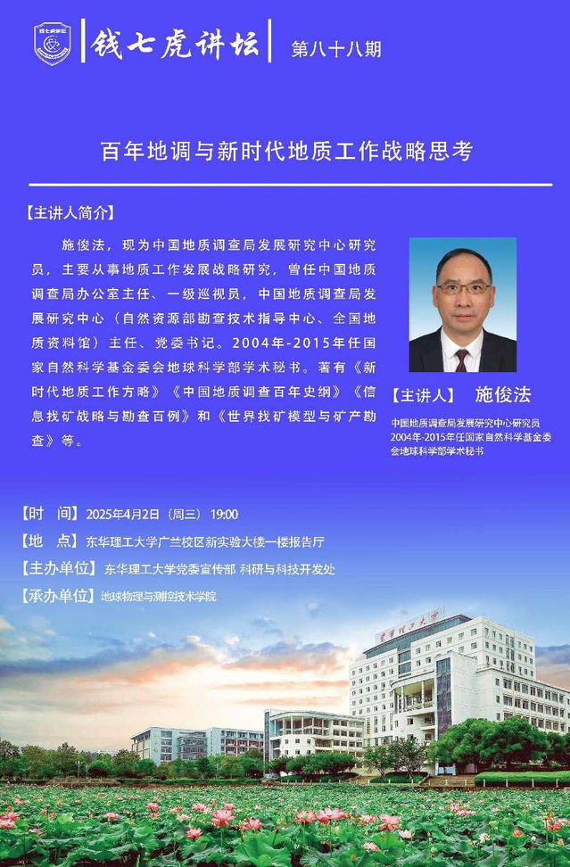 应地球物理与测控技术学院邀请,现中国地质调查局发展研究中心研究员施俊法到“华体会体育官方网站”,以“百年地调与新时代地质工作战略思考”为主题开展讲座。欢迎全校师生届时前往聆听。