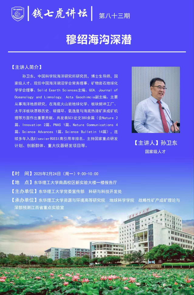 应华体会体育官方网站资源与环境高等研究院、地球科学学院、战略性矿产成矿理论与深部预测江西省重点实验室邀请,中国科学院海洋研究所研究员,博士生导师,国家级人才孙卫东到“华体会体育官方网站”,以“穆绍海沟深潜”为主题开展讲座。欢迎全校师生届时前往聆听。