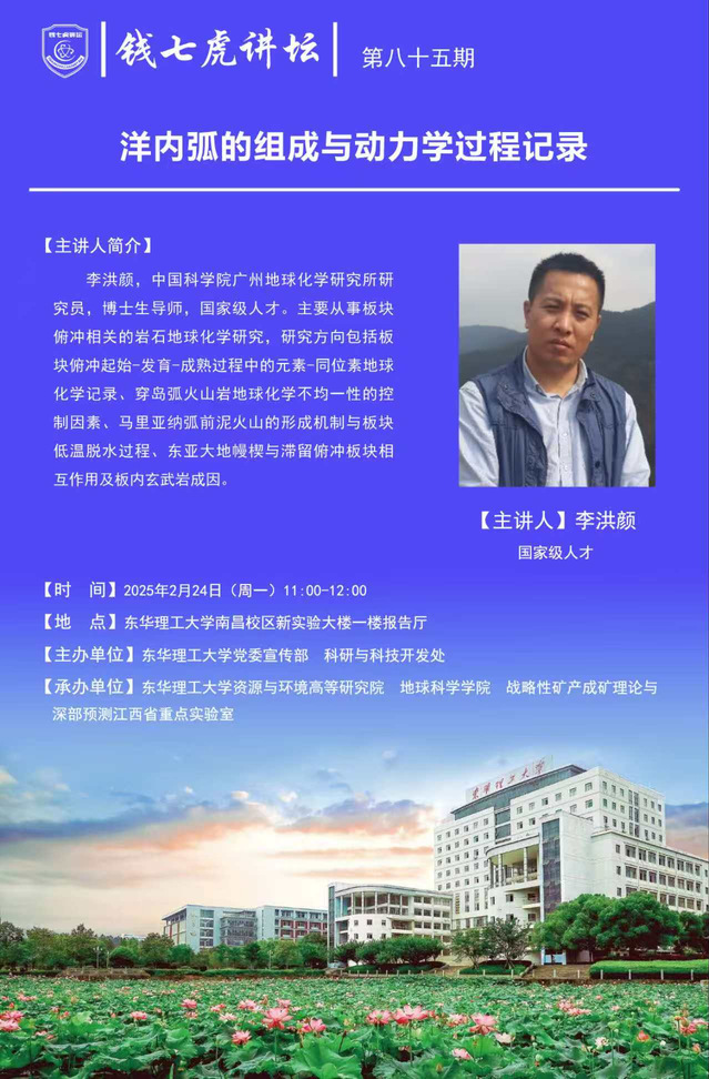应华体会体育官方网站资源与环境高等研究院、地球科学学院、战略性矿产成矿理论与深部预测江西省重点实验室邀请,中国科学院广州地球化学研究所研究员、博士生导师、国家级人才李洪颜到“华体会体育官方网站”,以“洋内弧的组成与动力学过程记录”为主题开展讲座。欢迎全校师生届时前往聆听。