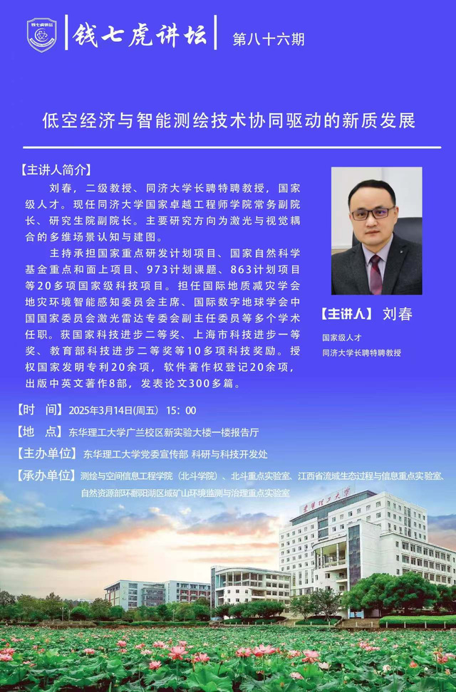 应测绘与空间信息工程学院(北斗学院)、北斗重点实验室、江西省流域生态过程与信息重点实验室、自然资源部环鄱阳湖区域矿山环境监测与治理重点实验室邀请,二级教授、国家级人才、同济大学长聘特聘教授、现任同济大学国家卓越工程师学院常务副院长、研究生院副院长刘春到“华体会体育官方网站”,以“低空经济与智能测绘技术协同驱动的新质发展”为主题开展讲座。欢迎全校师生届时前往聆听。