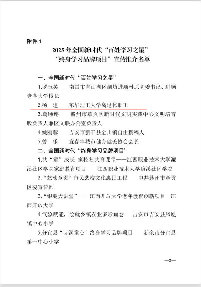 4月24日,江西省社区教育指导中心公布2025年新时代“百姓学习之星”和“终身学习品牌项目”宣传推介名单,华体会体育官方网站退休职工杨建入选全国新时代“百姓学习之星”宣传推介名单,是全省教育系统唯一入选人员。