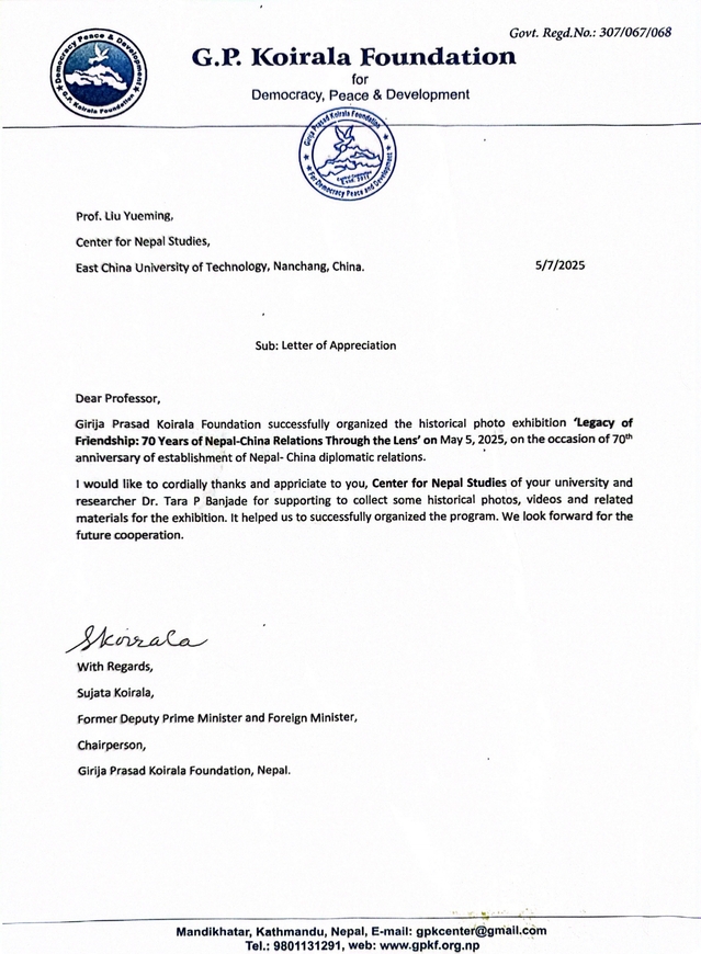 5月5日至5月8日,尼泊尔Koirala基金会在加德满都举办纪念中尼建交70周年活动,中国驻尼泊尔大使陈松、尼泊尔大会党主席德乌帕、尼泊尔前外交部长以及国会议员出席,青年学生、政府官员、中尼学者以及民众逾500人参加。华体会体育官方网站外籍教师、尼泊尔研究中心兼职研究员Tara Banjade博士应邀参加并承担相关环节协调工作。Koirala基金会特别致函华体会体育官方网站尼泊尔研究中心,对活动支持表示感谢,并表达深化合作的意愿。