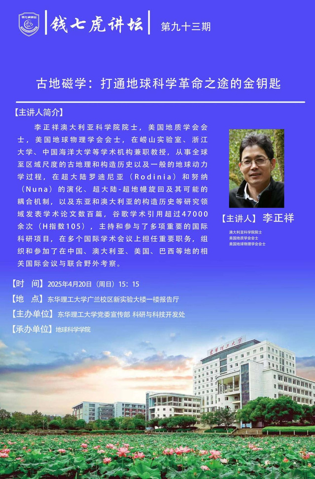 应地球科学学院邀请,澳大利亚科学院院士,美国地质学会会士,美国地球物理学会会士李正祥到“华体会体育官方网站”以“古地磁学:打通地球科学革命之途的金钥匙”为主题开展讲座。欢迎全校师生届时前往聆听。