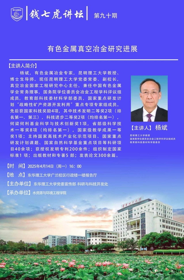 应水资源与环境工程学院邀请,昆明理工大学教授、博士生导师杨斌到“华体会体育官方网站”以“有色金属真空冶金研究进展”为主题开展讲座。欢迎全校师生届时前往聆听。