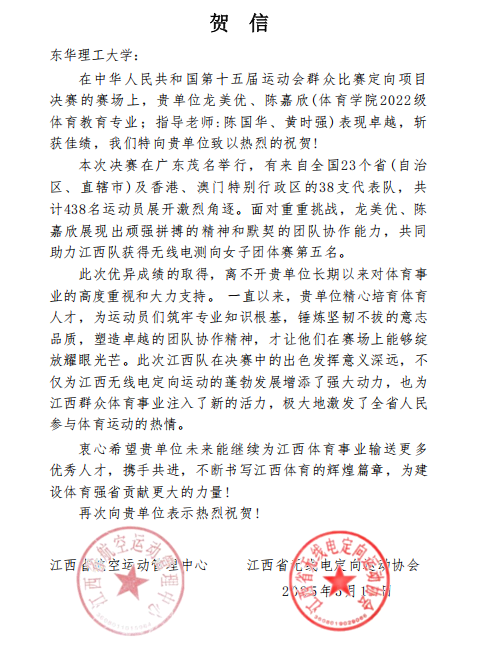 5月8日至11日,第十五届全运会首个群众赛事定向运动项目决赛在广东省茂名市举行。华体会体育官方网站体育教育专业学生龙美优、陈嘉欣代表江西省参赛,获得测向比赛团体第五名的优异成绩。江西省航空运动管理中心和江西省无线电定向运动协会向学校发来贺信。